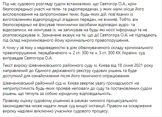 "То есть, он непосредственно не фиксировал техническими средствами соответствующие аудио- и видеозаписи, не монтировал их, не записывал какие-либо носители и не распространял их. Это указывает на то, что действия Святогора не подпадают под состав инкриминированного ему криминального производства", - рассказали в суде.