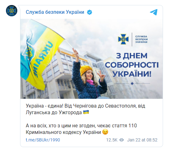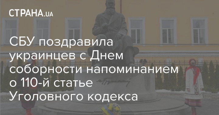 Служба безопасности Украины поздравила украинцев с Днем соборности напоминанием об уголовной ответственности за сепаратизм.