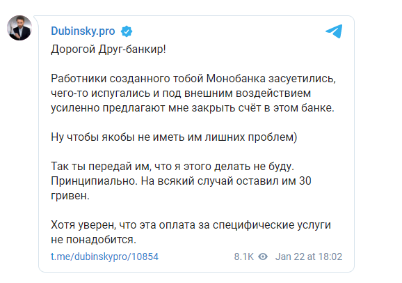 "Дорогой Друг-банкир! Работники созданного тобой monobank засуетились, чего-то испугались и под внешним воздействием усиленно предлагают мне закрыть счет в этом банке. Ну чтобы якобы не иметь им лишних проблем. Так ты передай им, что я этого делать не буду. Принципиально", - написал Дубинский, не называя конкретного адресата.