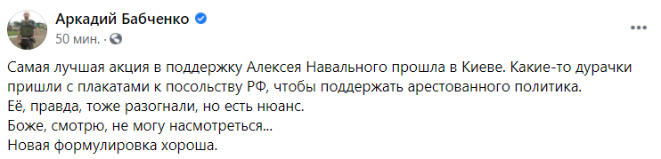 "Самая лучшая акция в поддержку Алексея Навального прошла в Киеве. Какие-то дурачки пришли с плакатами к посольству РФ, чтобы поддержать арестованного политика.