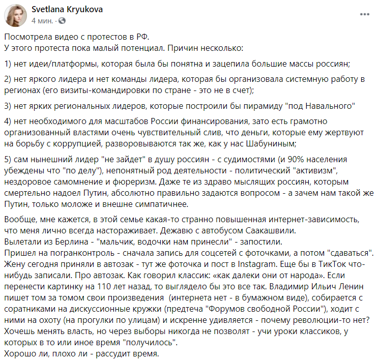 Заместитель главного редактора "Страны" Светлана Крюкова подробно пишет, почему протесты Навального пока не показывают перспектив.