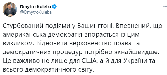 "Обеспокоен событиями в Вашингтоне. Уверен, что американская демократия справится с этим вызовом. Восстановить верховенство права и демократических процедур нужно как можно быстрее. Это важно не только для США, но и для Украины и всего демократического мира", - написал тогда министр Дмитрий Кулеба.