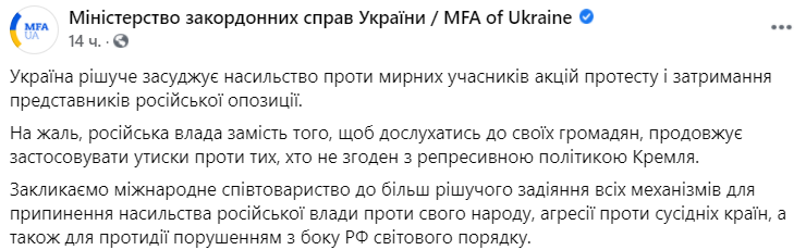 Украина решительно осуждает насилие против мирных участников акций протеста и задержания представителей российской оппозиции", - говорится в сообщении МИД.