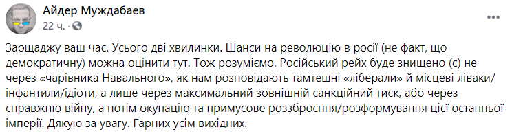 Еще один выходец из России - работающий в Украине журналист Айдер Муждабаев - пишет, что Россию могут победить только санкции или оккупация, но не Навальный.
