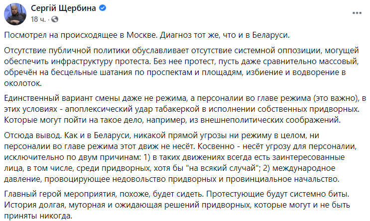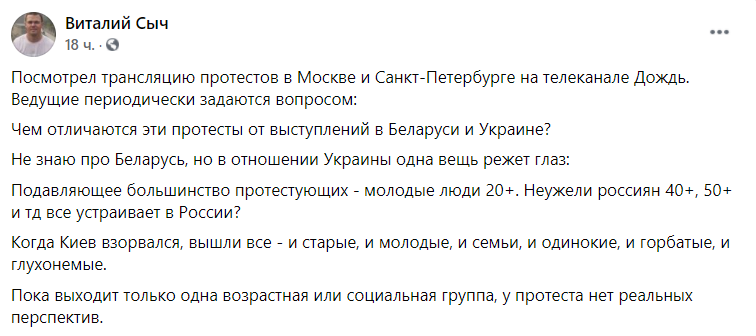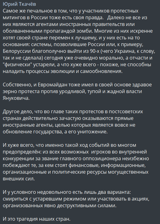 "Самое же печальное в том, что у участников протестных митингов в России тоже есть своя правда. Далеко не все из них являются агентами иностранных правительств или оболваненными пропагандой зомби. Многие из них искренне хотят своей стране перемен к лучшему, и у них есть на то основания: системы, позволившие России или, к примеру, Белоруссии благополучно выйти из 90-х (чего Украина, к слову, так и не сделала), сегодня уже очевидно морально, а отчасти и "физически" устарели, а что хуже всего - похоже, не способны наладить процессы эволюции и самообновления.