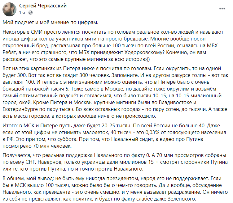 Блогер Сергей Черкасский доносит мысль, что протесты за Навального были малочисленными. А, следовательно, его надежды на власть тщетны.