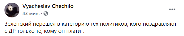 Журналист Вячеслав Чечило пишет, что "Зеленский перешел в категорию тех политиков, кого поздравляют с ДР только те, кому он платит".