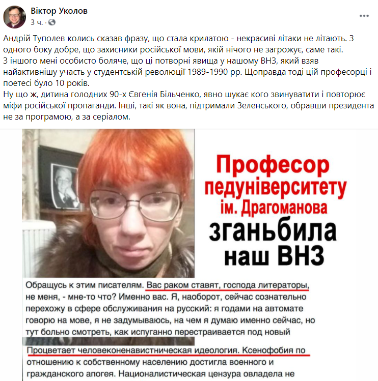 Он начал под каждым постом педуниверситета Драгоманова писать однотипную фразу: "Почему у вас работает Бильченко, которая пропагандирует русский мир и называет российско-украинскую войну гражданской?"