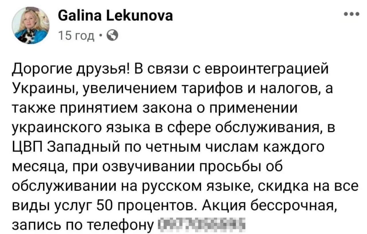 "В связи с евроинтеграцией Украины, увеличением тарифов и налогов, а также принятием закона о применении украинского языка в сфере обслуживания, в ЦВП Западный по четным числам каждого месяца, при озвучивании просьбы об обслуживании на русском языке, скидка на все виды услуг 50%", — написала владелица ветклиники Галина Лекунова на своей странице в Фейсбуке (сейчас пост недоступен).