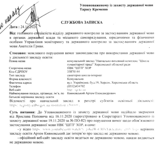 Так, 16 ноября 2020 года, некий Ярослав Попович прислал жалобу в Институт языкового омбудсмена о том, что директор "Школы гуманитарного труда" Артем Кияновский дает интервью о школе на русском языке и сайт учебного заведения тоже функционирует на русском языке.
