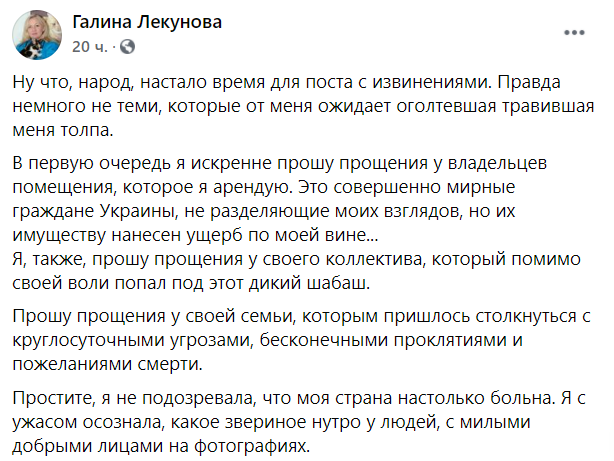 "Простите, я не подозревала, что моя страна настолько больна. Я с ужасом осознала, какое звериное нутро у людей с милыми, добрыми лицами на фотографиях", - написала она.
