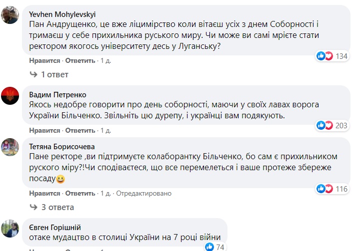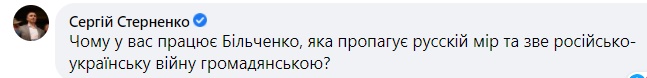 Как видим, на ниве онлайн-травли - все тот же радикал Стерненко, который чуть ли не под каждым постом педуниверситета Драгоманова пишет однотипную фразу: "Почему у вас работает Бильченко, которая пропагандирует русский мир и называет российско-украинскую войну гражданской?".