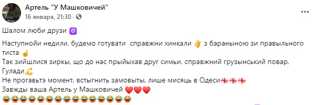 "А добрі деееееень Сьогодні розпочинаемо размовний ци(ы)рк. Будемо балакать на украйонській молві. Нагадую, надягайте маски, не намагайтесь пролизты в приміщення кав'ярні. Будьте  адекватні на скільки це можливо. Дяяяяякуемо".