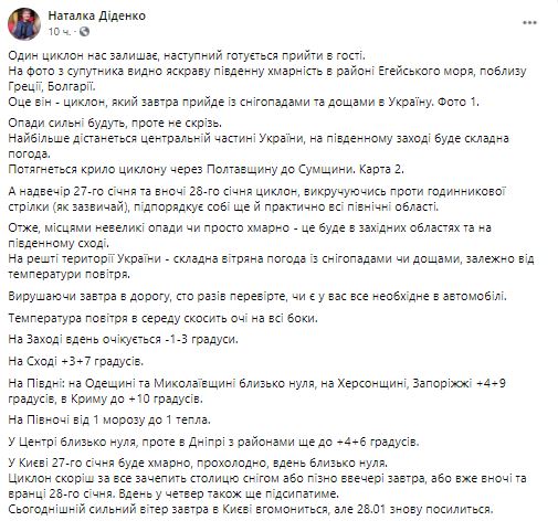 Как пишет синоптик Наталья Диденко, 27 января пройдут сильные осадки, но не везде. Больше всего достанется центральной части Украины, на юго-западе также будет сложная погода. Циклоном также накроет Полтавскую и Сумскую область. Вечером 27 января и ночью 28 января циклон охватит практически все северные области. В этих регионах ожидаются самые сильные осадки.
