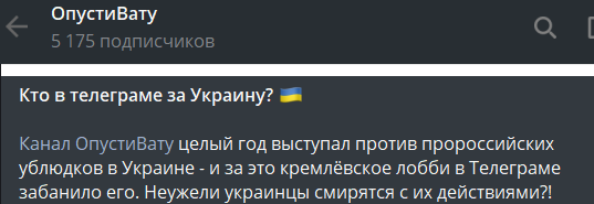 "Канал ОпустиВату целый год выступал против пророссийских ублюдков в Украине - и за это кремлёвское лобби в Телеграме забанило его", - сообщается на резервном аккаунте 28 января.