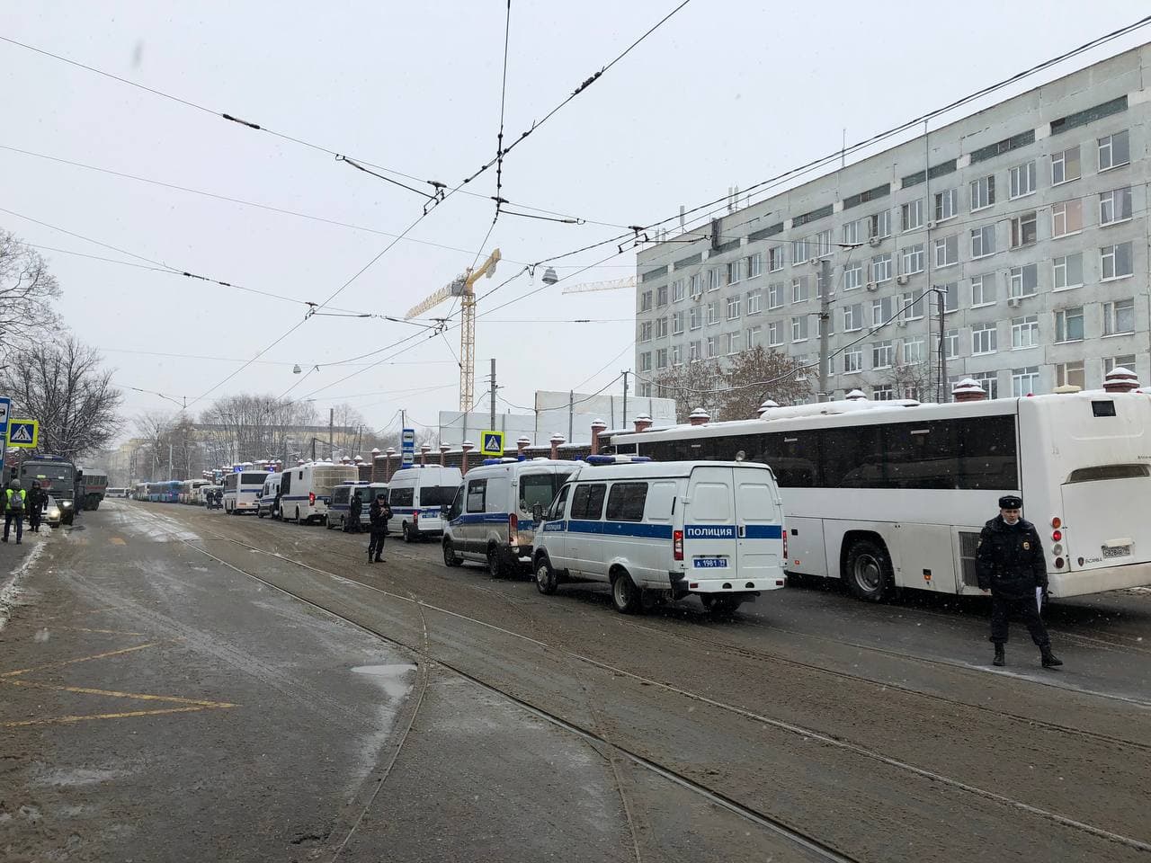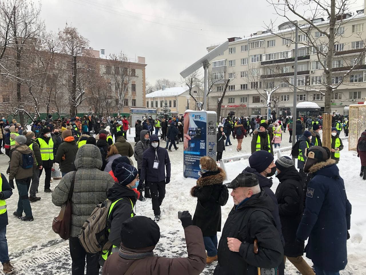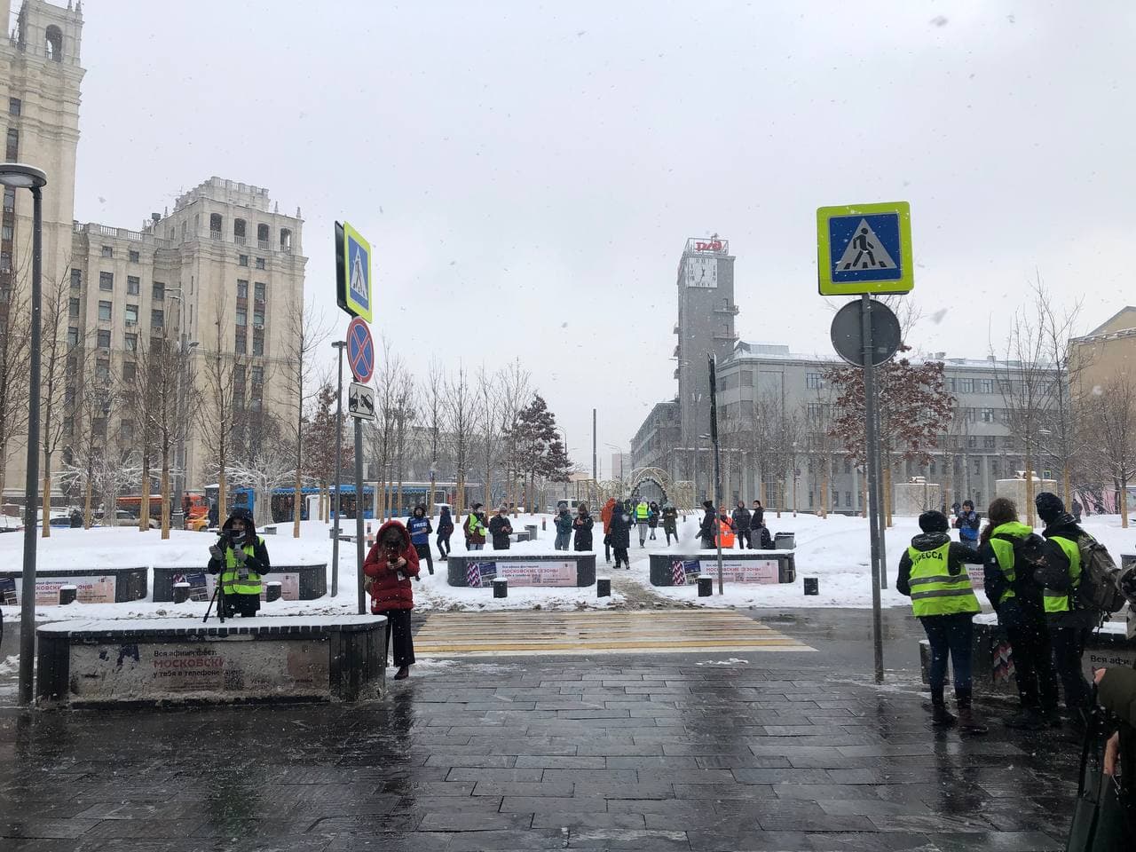 10:51 Люди подъезжают на метро, выходит по 5-10 человек. Пока протестующих человек 200 максимум. Отметим, что сегодня погода сложная для массовых акций: идёт снег, ветрено, все сразу тает, под ногами "каша".