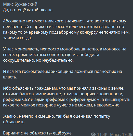 "Четвертый год наблюдаю, как бдительный Госкомитет телевидения и радиовещания Украины, в лучших традициях Главлита при Наркомпросвещения СССР, отлавливает враждебную литературу и решительно охраняет от нее умы наших читателей.