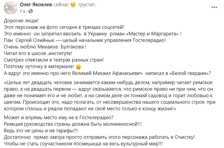 "Некоторые взялись доказывать, что упоминание (!) в предисловии (!) российского актёра, сыгравшего в экранизации "Мастера и Маргариты" достаточное основание для запрета на ввоз книги. То есть даже если считать, что фраза "Крым - наш", публично сказанная Басилашвили или Олейниковым, не в гипертрофированной фантазии ура-патриотов, а в реальности нанесла вред Украине, все равно натянутый аргумент не работает, ведь упомянут он без этой цитаты.
