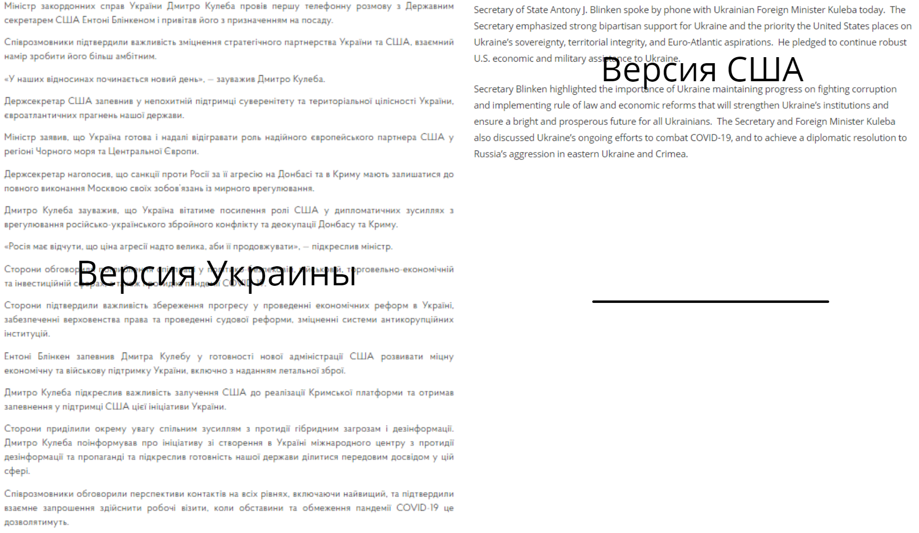 Ничего этого в госдеповской версии нет - там говорится лишь о "военной помощи Украине". Также ничего не говорится о создании в Украине международного центра по противодействию дезинформации, которому Кулеба посвятил целый абзац.