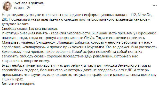 "Не дожидаясь утра уже отключены три ведущих информационных канала - 112, NewsOn, ZIK. Последствия указа президента о санкция против формального владельца каналов - депутата Козака. Свобода слова. Так она выглядит.