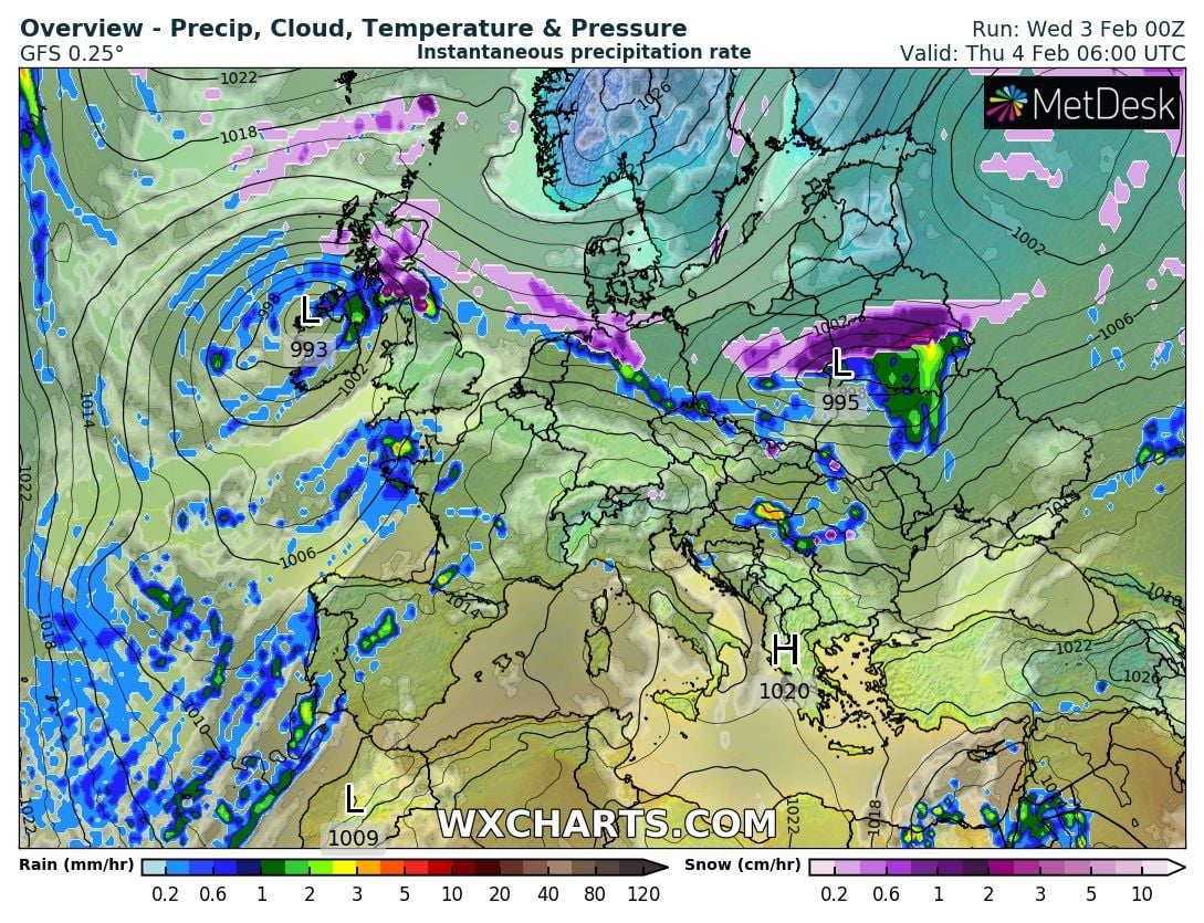 В четверг, 4 февраля, в Украину придет циклон Siegbert вместе с атмосферными фронтами, что станет причиной осадков в большинстве регионов страны. При этом температура воздуха будет выше 0.