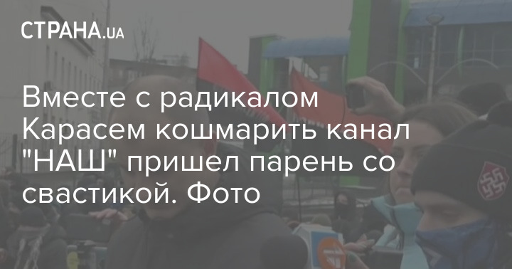 Сегодня под зданием телеканала "НАШ" прошла акция националистов, которые требовали закрытия вещателя. Одним из активных участников данного мероприятия был глава праворадикальной организации "Основа будущего" (бывшая "С14") Евгений Карась, который в какой-то момент принялся агрессивно оскорблять журналистов канала.