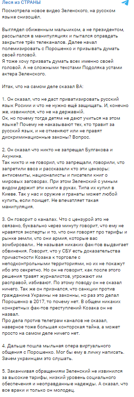 "Посмотрела новое видео Зеленского, на русском языке снизошел.