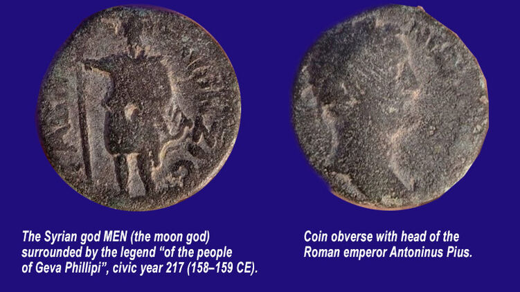 На одной стороне монеты изображена голова римского императора Антонина Пия и набита дата 158 - 159 н.э. На обратной части монеты изображен бог Мэн и надпись "жителей Гева Филллипи".