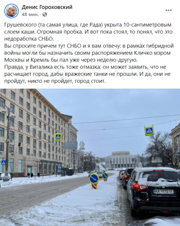 Блогер Денис Гороховский пишет, что улицу Грушевского, где находится Верховная Рада, заблокировал уже растаявший снег.