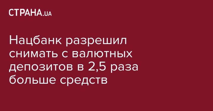 С 15 сентября Нацбанк увеличил сумму, которую можно единовременно снимать с валютных депозитов в сутки со 100 до 250 тысяч гривен. Об этом сообщает "Интерфакс Украина".