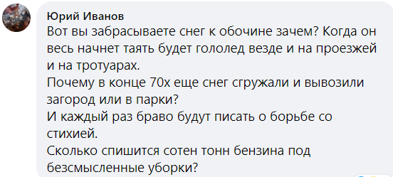 "Вот вы забрасываете снег к обочине зачем? Когда он весь начнет таять будет гололед везде и на проезжей и на тротуарах. Почему в конце 70х еще снег сгружали и вывозили загород или в парки? И каждый раз браво будут писать о борьбе со стихией. Сколько спишется сотен тонн бензина под безсмысленные уборки?", - спрашивает Юрий Иванов.