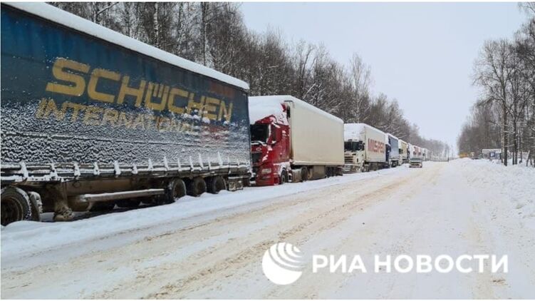 Из-за мощного снегопада в пятницу, 12 февраля, более сотни грузовиков выстроились в очередь на российско-украинской границе в Брянской области РФ.
