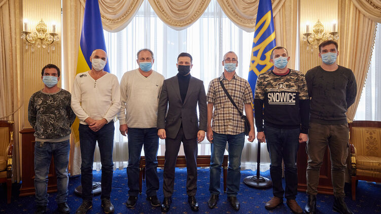 Президент Украины Владимир Зеленский встретился в Киеве с освобожденными моряками-членами экипажа судна Stevia, которых захватили пираты в Гвинейском заливе в декабре 2020 года.