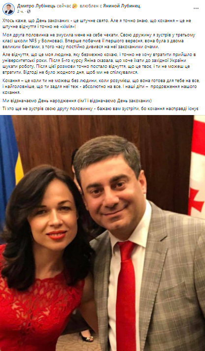 Тем временем глава Госмиграционной службы Максим Соколюк написал небольшое эссе на трех языках о том, как любовь к "девочке из Уханя" Анастасии Зинченко перевернула его в жизнь в 43 года. Чиновник также опубликовал к празднику совместную фотографию со своей возлюбленной.