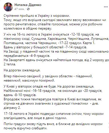 Днем 16 февраля в большинстве областей -7...-14. На Западе, в южной части и на юго-востоке до -4...-9. На Закарпатье днем ожидается теплая погода, от -2 до +2. На дорогах гололедица. Ветер северо-западный, в западных областях - юго-западный, небольшой.