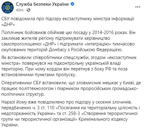 Спецслужба заявила, что подозреваемый с 2014 по 2016 годы находился в руководстве "Донецкой народной республики" и "публично призвал население региона к поддержке официальной позиции руководства самопровозглашенной ДНР".