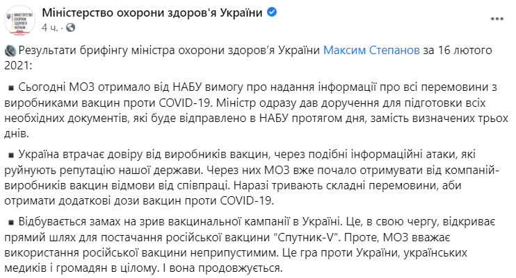 "Это (уголовное дело - Ред.), в свою очередь, открывает прямой путь для поставки вакцины "Спутник-V". Однако Минздрав считает использование российской вакцины недопустимым. Это игра против Украины, украинских медиков и граждан в целом. И она продолжается", - заявил министр.