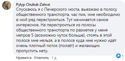 "Так как раз на этом участке камера и находится за 10 метров до прерывистой полосы въезда на полосу ОТ, а эта прерывистая находится практически перед поворотом на Печерский мост. Там, наоборот, нужно убрать полосу ОТ на этом участке примерно 100 метров от съезда до заезда на серпантин. Так что ничего вы не врахували, а просто решили срубить штрафов, да побольше".