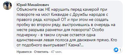В комментариях к посту первого замначальника департамента патрульной полиции Алексея Белошицкого, который анонсировал новшество, некоторые водители пожаловались на то, что камера на этом участке поставлена не очень удобно, ведь водителям нужно поворачивать на Печерский мост, а без заезда на полосу там будут возникать пробки.