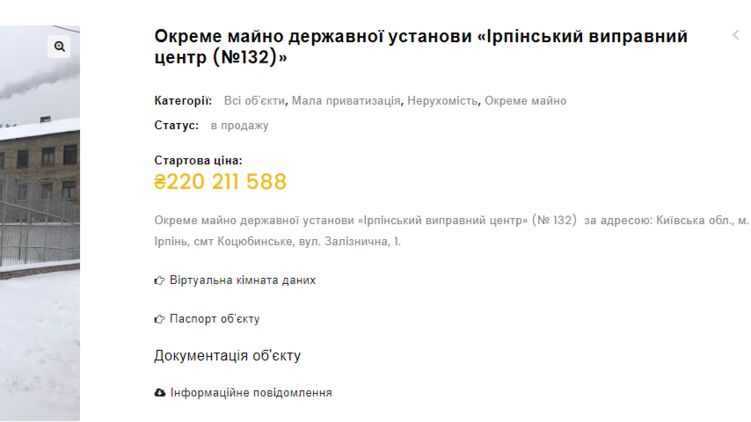 Министр юстиции Украины Денис Малюська объявил о том, что на аукцион выставлена первая украинская тюрьма. Таким учреждением в Украине стал Ирпенский исправительный центр (№132), который находится в поселке Коцюбинское Киевской области.
