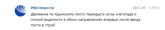 Утром в пятницу, 19 февраля, по Крымскому мосту, соединяющему Керченский и Таманский полуострова, перекрыто движение из-за мощного снегопада и плохой видимости. Это произошло впервые с момента завершения его строительства.