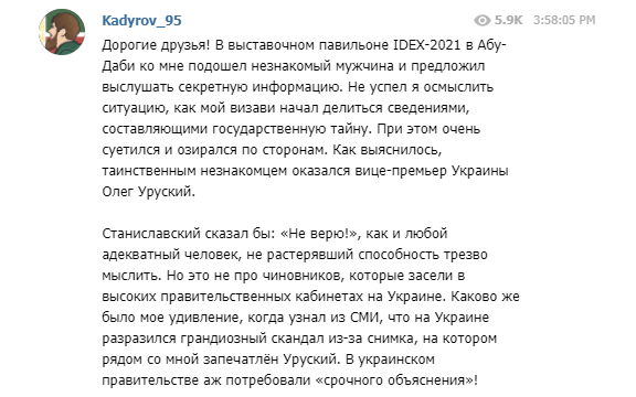 Глава Чечни Рамзан Кадыров прокомментировал его снимок с вице-премьер-министром по стратегическим отраслям промышленности Олегом Уруским, где оба запечатлены на военной выставке в Абу-Даби. Фото стало причиной скандала и требования объяснений, которые запросил премьер-министр Украины Денис Шмыгаль.