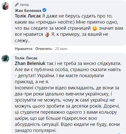 "Очень, очень плохой пример показываете. Вы пропагандируете среди иностранцев тренд, что все украинцы по умолчанию говорят на русском языке. Почему бы не сказать, что вы понимаете украинский (даже если её не понимаете, или плохо говорите? Всратый украинский депутат...)", - написал Толик Лысак.