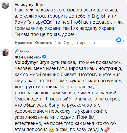 "... мне показалось, человек меня идентифицировал как иностранца, как со мной обычно бывает! Поэтому и уточнил ему, а как это по форме, "українською розумію", "по -русски понимаю", "по нашему разговариваю" - для меня не имеет значения! Смысл один - Я местный! Ни для кого не секрет, что общаюсь в быту на русском, хотя с удовольствием перехожу на украинский с украиноязычными людьми! Причём, естественно, не после того, как меня кто-то об этом попросил, а сам, по зову сердца", - подытожил Жан Беленюк.