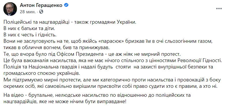 "То, что вчера было под Офисом Президента - это отнюдь не мирный протест. Это была вакханалия насилия, не имеет ничего общего с ценностями Революции Достоинства. Полиция и Национальная гвардия и в дальнейшем будут стоять на защите внутренней безопасности и общественного спокойствия украинцев. Мы поддерживаем мирные протесты, но мы категорически против насилия и провокаций со стороны отдельных лиц, самовольно решивших присвоить себе право судить кто прав, а кто нет", - написал он на своей странице в Facebook.
