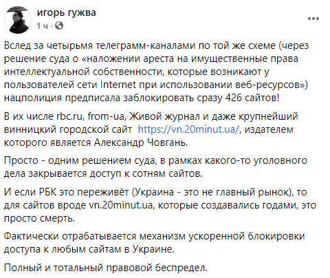 Фактически отрабатывается механизм ускоренной блокировки доступа к любым сайтам в Украине. Полный и тотальный правовой беспредел", - анализирует ситуацию главный редактор "Страны" Игорь Гужва.