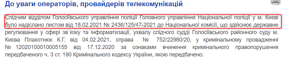 Также обращает на себя внимание, что в решении суда заявителем выступает частное лицо. Хотя в заявлении Нацкомсвязи говорится, что вердикт Голосеевского суда им направил следователь Нацполиции, который ведет это дело.