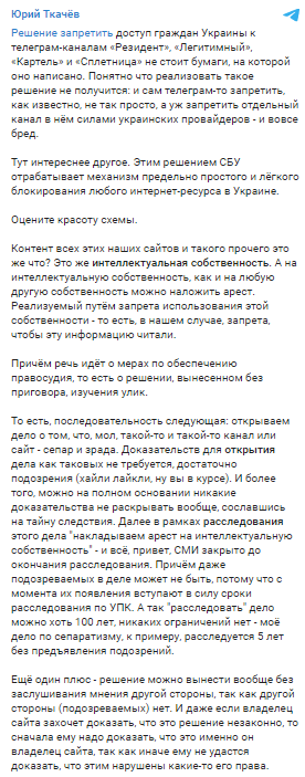 "Решение запретить доступ граждан Украины к телеграм-каналам "Резидент", "Легитимный", "Картель" и "Сплетница" не стоит бумаги, на которой оно написано. Понятно, что реализовать такое решение не получится: и сам Телеграм-то запретить, как известно, не так просто, а уж запретить отдельный канал в нём силами украинских провайдеров - и вовсе бред.