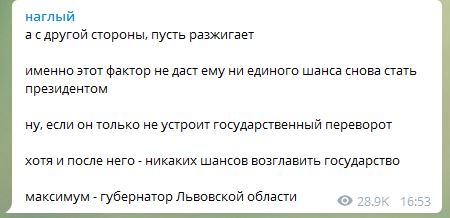 "А с другой стороны, пусть разжигает. Именно этот фактор не даст ему ни единого шанса снова стать президентом. Ну, если он только не устроит государственный переворот. Хотя и после него - никаких шансов возглавить государство. Максимум - губернатор Львовской области", - написал журналист Макс Назаров.