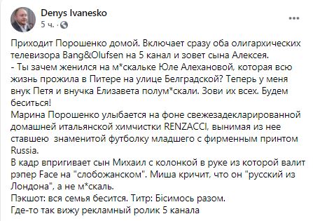 Где-то так вижу рекламный ролик 5 канала", - написал директор информагентства "Украинские новости" Денис Иванеско.